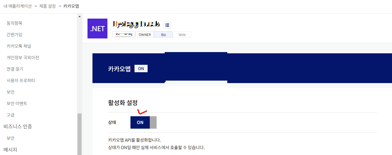 이후 카카오맵 API는 별도 승인요청 없이 [내 애플리케이션 - 제품 설정 - 카카오맵]에서 직접 ON 해주면 사용 가능하다.